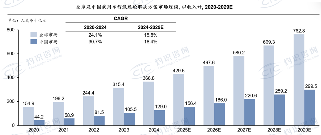 全球乘用车智能座舱解决方案的市场规模已由2020年的人民币1,549亿元增长至2024年的人民币3,668亿元,年均复合增长率为24.1%,预计到2029年将达到人民币7,628亿元,2024年至2029年的年均复合增长率为15.8%。中国是全球最大的乘用车市场。中国乘用车智能座舱解决方案市场规模由2020年的人民币442亿元增长至人民币1,290亿元,年均复合增长率为30.7%;预计到2029年将达到人民币2,995亿元,2024年至2029年的年均复合增长率为18.4%。