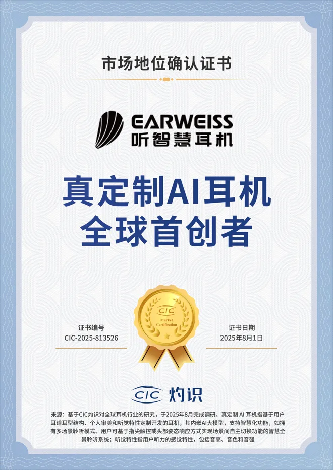 2025年8月,CIC灼识对全球耳机行业开展了专项的系统性研究,确认听智慧“真定制AI耳机全球首创者”的市场地位。