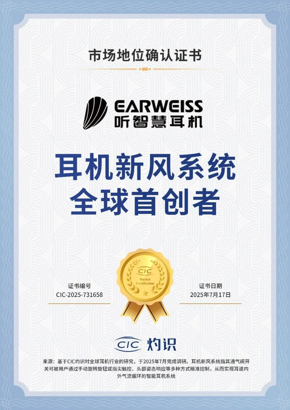 2025年7月,CIC灼识对全球耳机行业开展了专项的系统性研究,确认听智慧“耳机新风系统全球首创者”的市场地位。