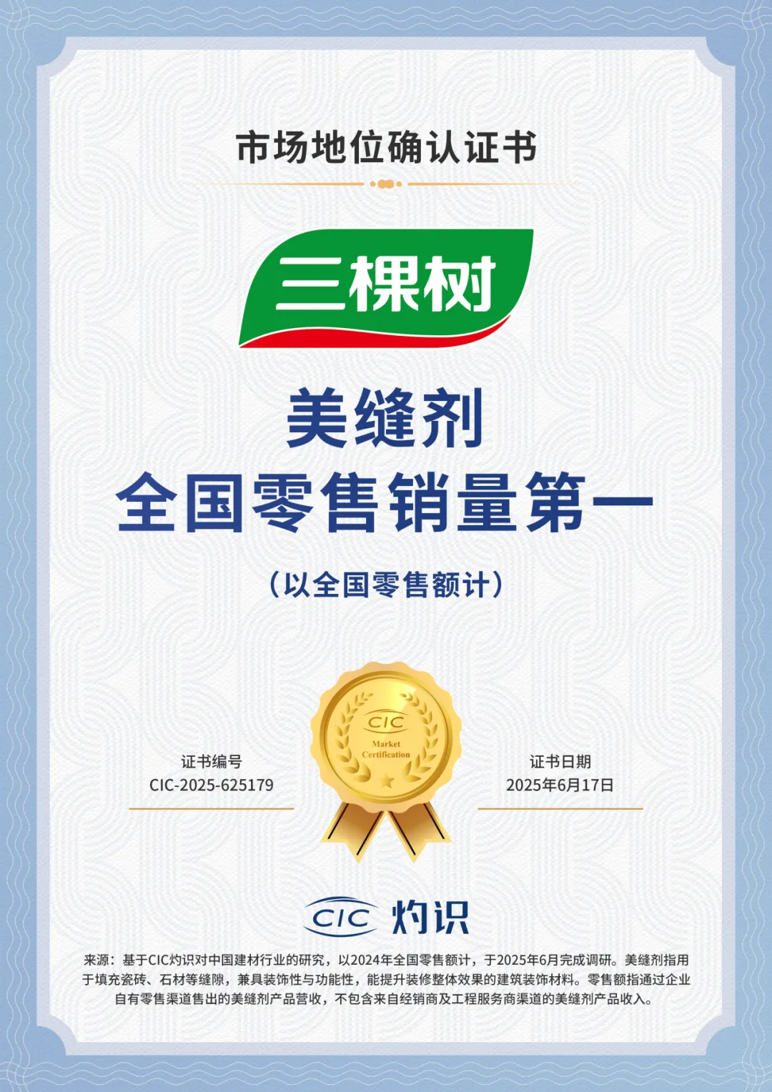 2025年6月,CIC灼识对中国建材行业开展了专项的系统性研究,确认三棵树“美缝剂全国零售销量第一(以2024年全国零售额计)”的市场地位。