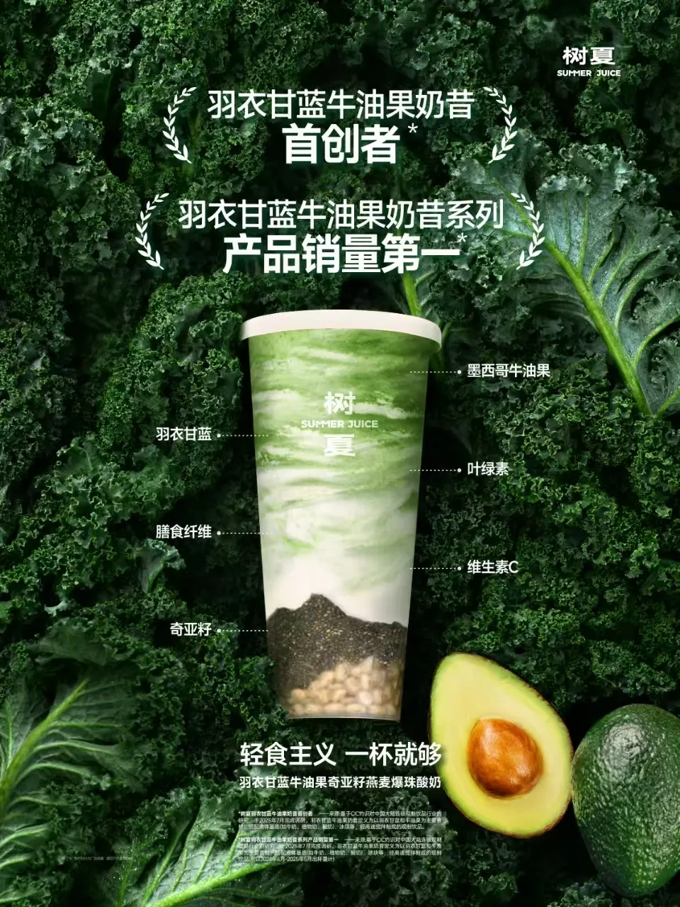 2025年7月,CIC灼识就中国大陆连锁现制饮品行业开展了专项的系统性研究,确认树夏“羽衣甘蓝牛油果奶昔系列产品销量第一(以2024年6月-2025年5月出杯量计)”、“羽衣甘蓝牛油果奶昔首创者”的市场地位。