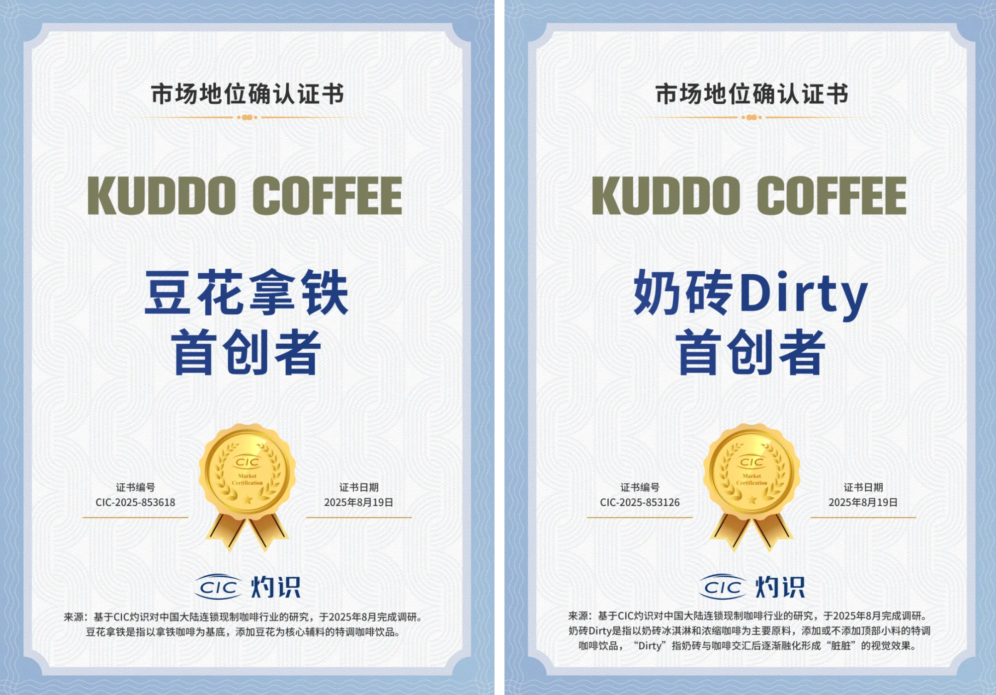 2025年8月,CIC灼识对中国连锁现制咖啡行业开展了专项的系统性研究,确认KUDDO COFFEE“豆花拿铁首创者”及“奶砖Dirty首创者”的市场地位。