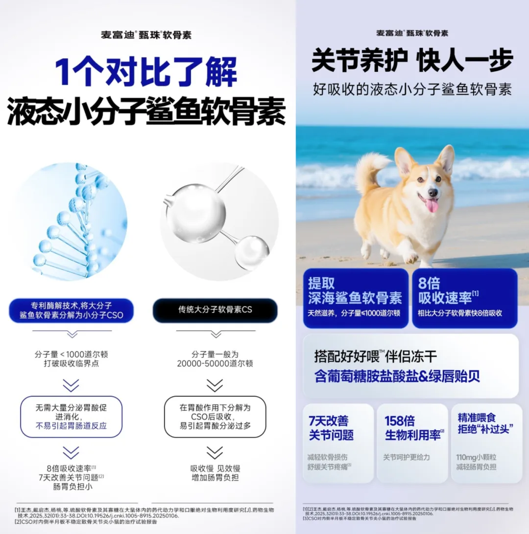 在此基础上,麦富迪甄珠®液态小分子软骨素产品以鲨鱼提取的CS-D型硫酸软骨素为基础,通过专利酶解技术和液态营养素保鲜技术将其分解至1000Da及以下的纳米级小分子结构,实现“无需胃酸分解、口服即可吸收”的结构重构。辅以脂质-寡糖协同递送体系,提升肠道吸收效率,临床实证显示,仅49分钟即可达血液浓度峰值,吸收速度为大分子软骨素的8倍,生物利用率是传统固态软骨素的158倍。根据吉林大学与警犬基地实测研究表明,产品效果作用明显。