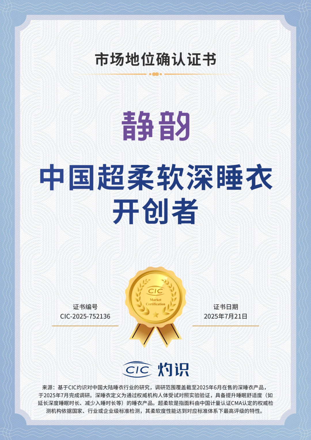 2025年7月,CIC灼识对中国大陆睡衣行业开展了专项的系统性研究,确认静韵 “中国超柔软深睡衣开创者”的市场地位。