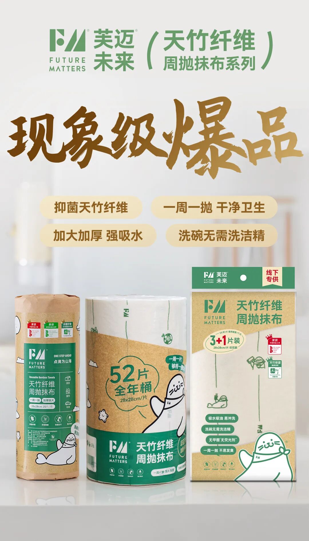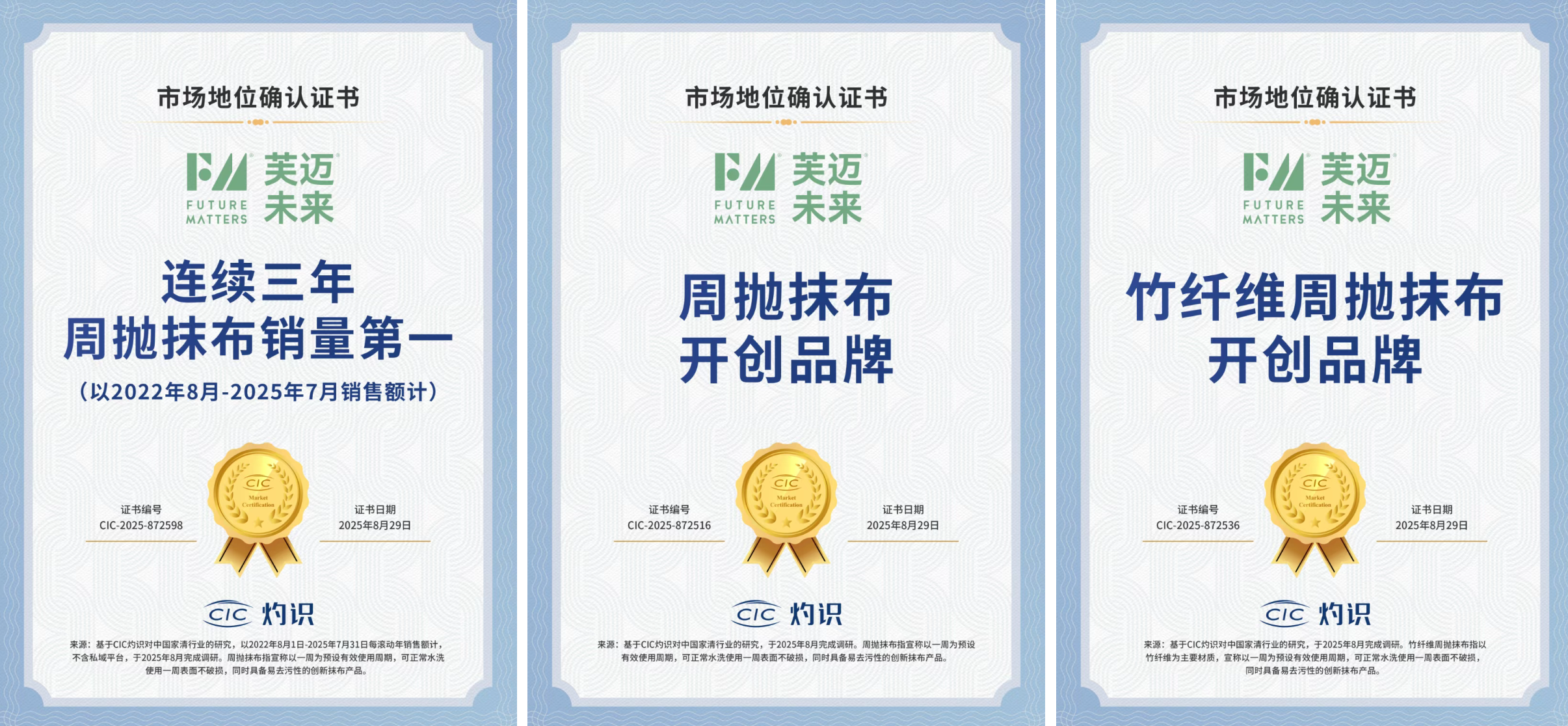 2025年8月,CIC灼识对中国抹布行业开展了专项的系统性研究,确认FUTURE MATTERS芙迈未来“连续三年周抛抹布销量第一(以2022年8月-2025年7月销售额计)”、“周抛抹布开创品牌”、“竹纤维周抛抹布开创品牌”的市场地位。