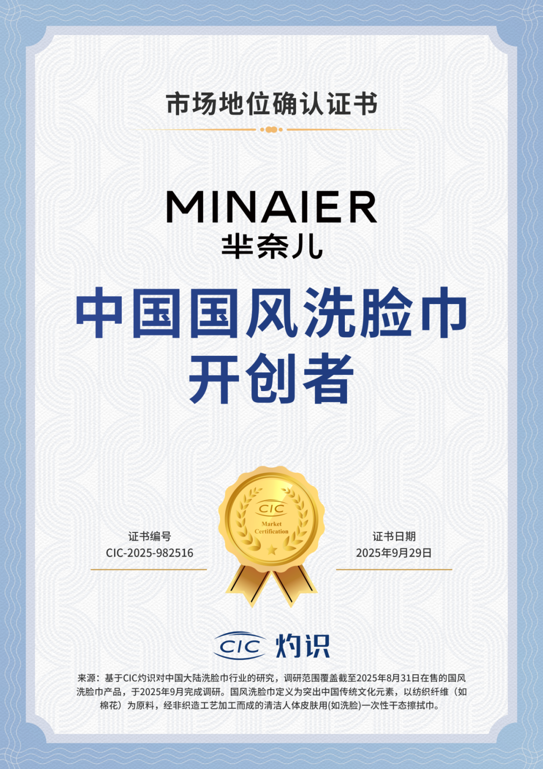 2025年9月,CIC灼识对中国大陆洗脸巾行业开展了专项的系统性研究,确认芈奈儿“中国国风洗脸巾开创者”的市场地位。