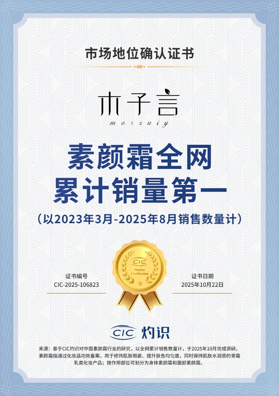 2025年10月,CIC 灼识市场研究(以下简称“CIC 灼识”)对中国素颜霜行业开展了专项的系统性研究,确认木子言“素颜霜全网累计销量第一(以2023年3月-2025年8月销售数量计)”的市场地位。