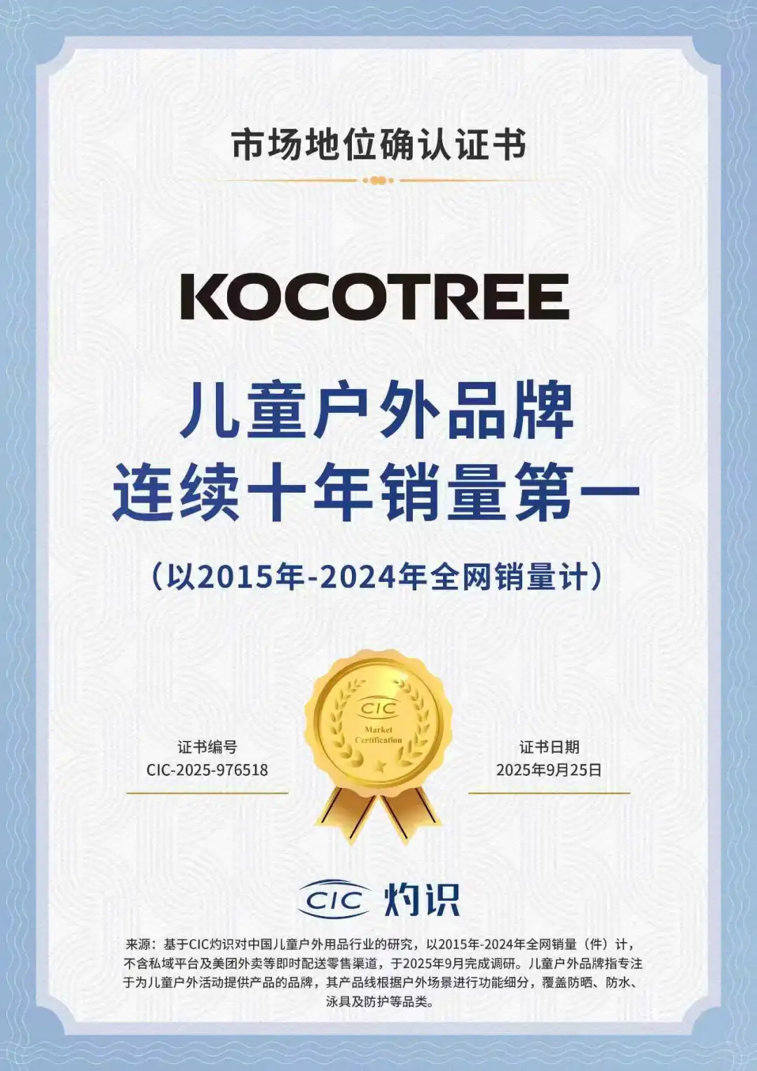 2025年9月,CIC 灼识市场研究(以下简称“CIC 灼识”)对中国儿童户外用品行业开展了专项的系统性研究,确认KOCOTREE“儿童户外品牌连续十年销量第一(以2015年-2024年全网销量计)”的市场地位。