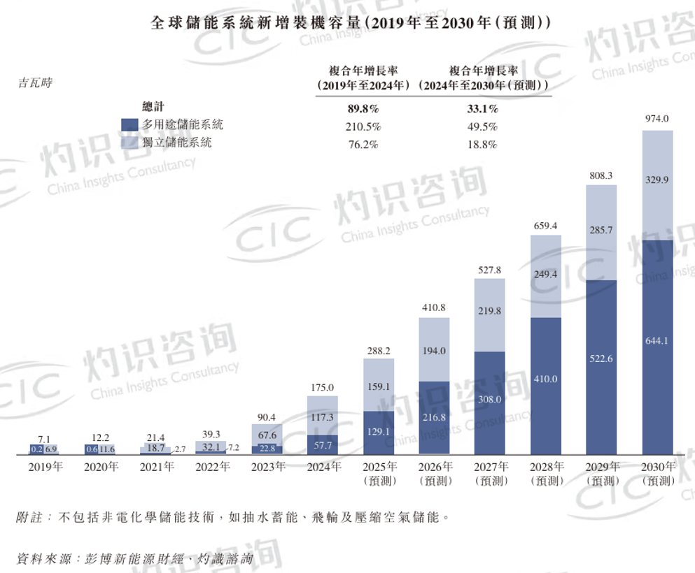 根据 CIC 灼识咨询报告,自2019年至2024年,全球新增多用途储能系统装机容量从0.2GWh增长至57.7GWh,复合年增长率为210.5%。预计到2030年,该数值将增长至644.1GWh,复合年增长率为49.5%。多用途储能系统的渗透率在2019年为2.8%,其后于2024年升至33.0%。预计到2030年,渗透率将达到66.1%。