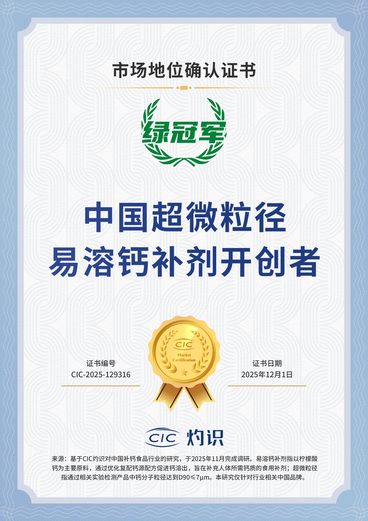 2025年11月,CIC 灼识市场研究(以下简称“CIC 灼识”)对中国补钙食品行业开展了专项的系统性研究,确认绿冠军“中国超微粒径易溶钙补剂开创者”的市场地位。