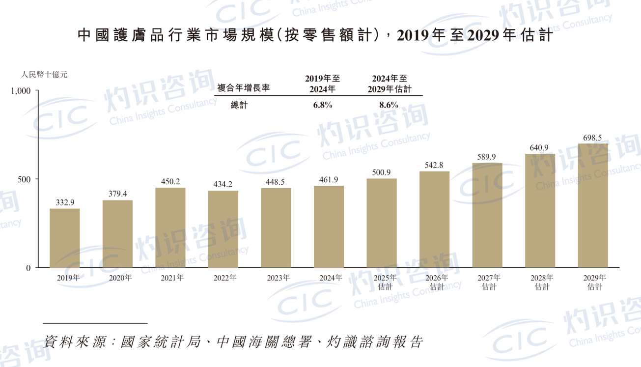 CIC 灼识咨询作为独立第三方行业研究与分析机构,对中国化妆品以及中国护肤品行业进行了深入研究与预测,涵盖市场规模、竞争格局、增长动力、行业趋势等方面,为本行业提供全面、系统的市场洞察。 中国作为全球最大的化妆品市场之一,行业规模保持稳定增长。根据 CIC 灼识咨询报告,护肤产品在整体中国化妆品市场中所占比例最大,2024年占总市场零售额的67.1%,随着随着护肤需求逐渐成为消费者日常生活中的核心需求之一,这一比例预计将继续上升。中国护肤品市场规模由2019年的人民币3,329亿元增加至2024年的人民币4,619亿元,并预计将维持增长趋势,于2029年达到人民币6,985亿元,2024年至2029年的复合年增长率为8.6%。