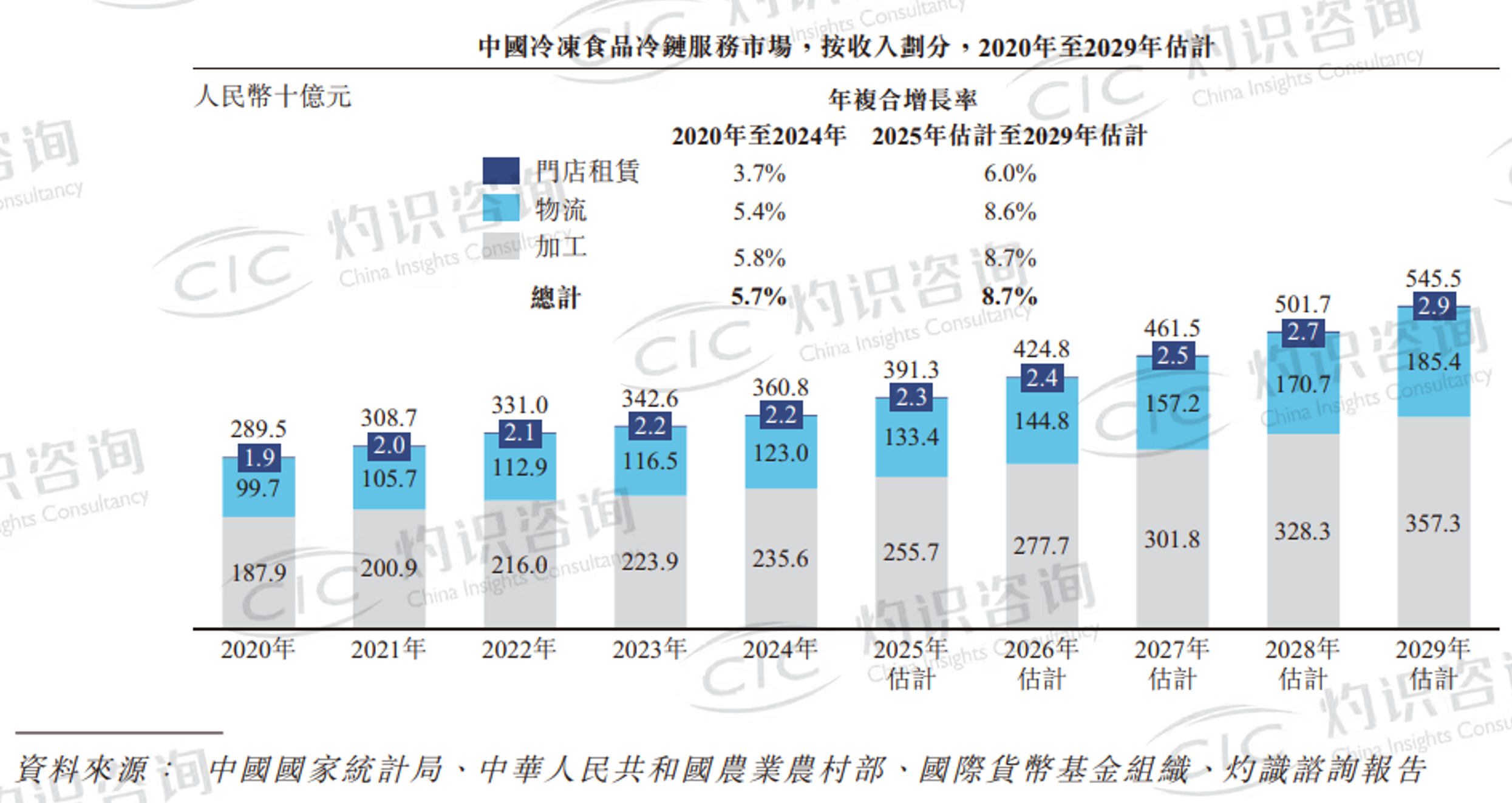 根据 CIC 灼识咨询报告,中国冷冻食品冷链服务市场(包括物流、门店租赁及加工服务)于2024年达到人民币3,608亿元,预计将于2029年增长至人民币5,455亿元,2025年至2029年的年复合增长率为8.7%。