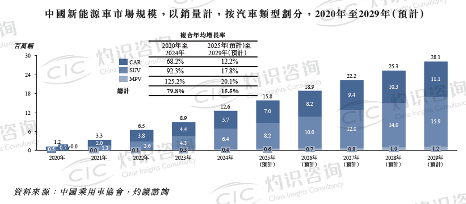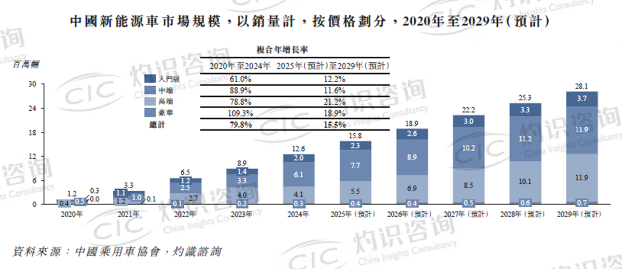 高端车型及豪华车型于2029年前将成为中国新能源车最具增长潜力的细分领域。随着中高收入群体的不断扩大及消费升级的持续推进,用户对高质量、智能化、个性化出行的需求日益增强,高端新能源车型的市场渗透率稳步提升。同时,智能化和电动化融合的发展趋势正在重塑高端汽车的价值标准,推动高端新能源市场快速扩大,成为新能源车产业竞争与价值集中的关键方向。2024年,中国高端车型和豪华车型的销量分别为4.1百万辆和0.3百万辆,2020年至2024年复合年均增长率分别为78.8%和109.3%。预计到2029年,中国高端车型和豪华车型的销量将分别上升至11.9百万辆和0.7百万辆,2025年至2029年期间复合年均增长率分别为21.2%及18.9%。
