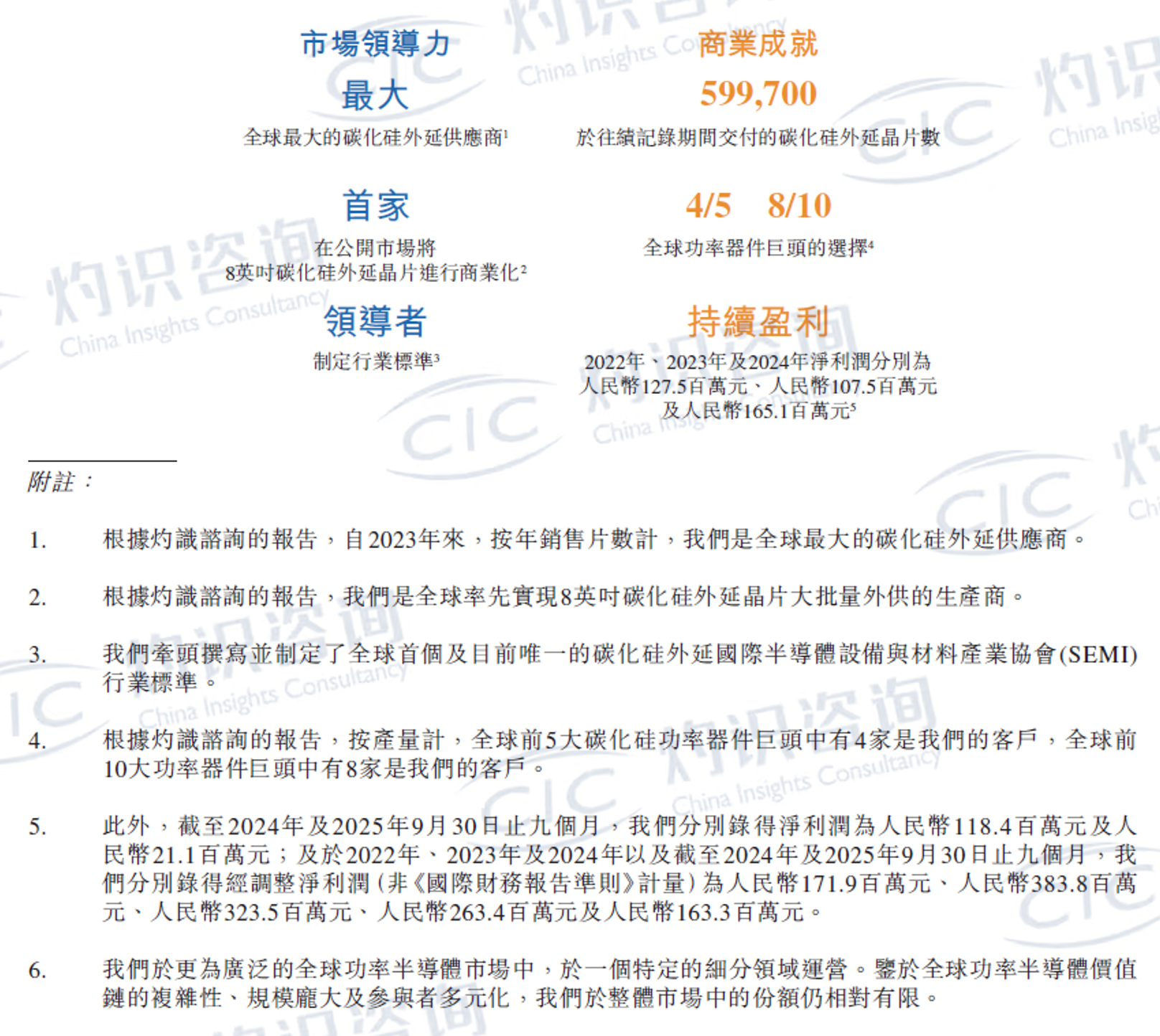 瀚天天成是全球领先的碳化硅外延晶片企业。根据CIC灼识咨询的报告,自2023年来,按年销售片数计,公司是全球最大的碳化硅外延供应商,2024年市场份额超过30%。同时也是首家在公开市场将8英寸碳化硅外延晶片进行商业化的企业。