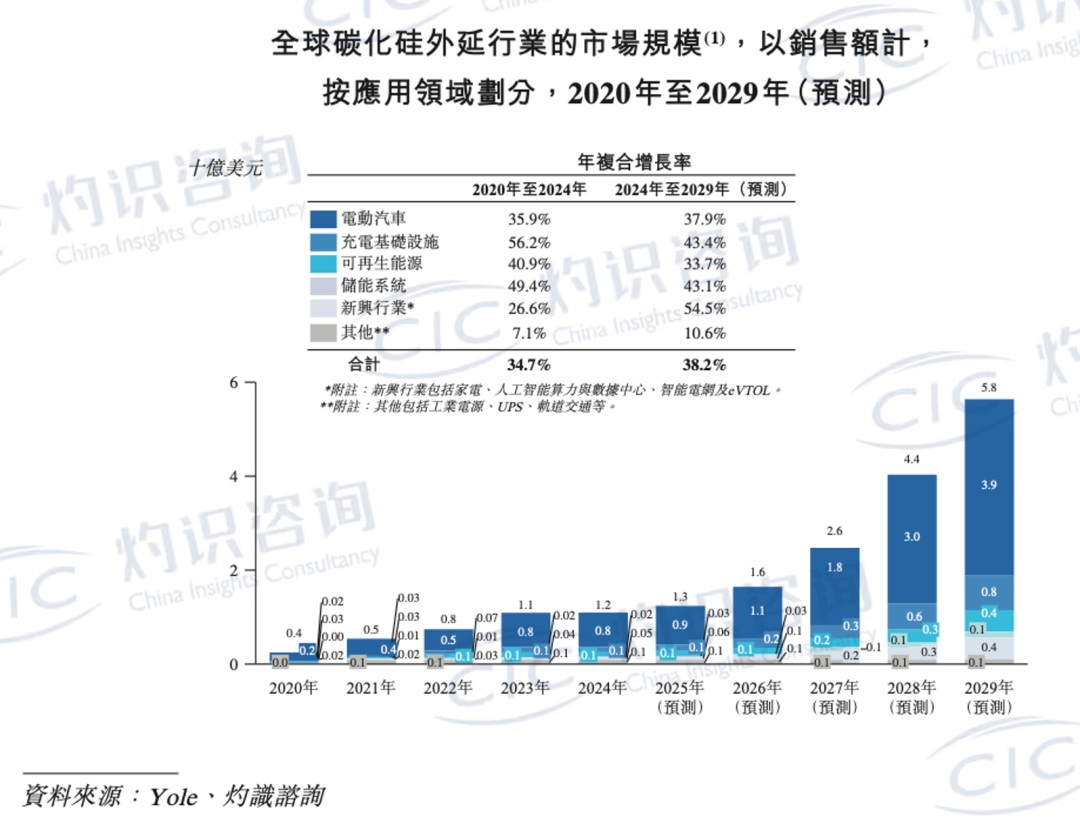 在全球能源转型与电气化趋势推动下,市场对高性能、高能效功率半导体器件的需求持续增长。碳化硅功率半导体器件凭藉优越的热性能、高击穿电压、较低开关损耗及提升整体系统效率的能力,正加快应用于电动汽车、可再生能源及储能系统等核心领域,以满足更高性能及能效需求。与此同时,家电、人工智能运算与数据中心、智能电网及eVTOL等新兴应用场景的持续拓展,亦进一步推动碳化硅功率半导体器件市场增长。预计2024年至2029年,全球碳化硅功率半导体器件市场将以39.9%的年复合增长率快速增长。作为器件制造的关键基础材料,碳化硅外延晶片需求将随下游器件市场扩容而同步提升,从而为全球碳化硅外延行业带来持续增长动能。