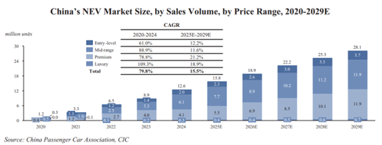 Premium and luxury NEVs are expected to become the most promising segments in China’s NEV market by 2029. Driven by the expansion of the middle-to-high-income population and ongoing consumption upgrades, consumer demand for high-quality, intelligent and personalized mobility is rising, steadily increasing the market penetration of premium NEVs. Meanwhile, the convergence of intelligence and electrification is reshaping the value proposition of premium vehicles, fueling rapid growth in the premium NEV market. In 2024, sales of premium and luxury NEVs in China reached 4.1 million and 0.3 million units, respectively, with CAGRs of 78.8% and 109.3% from 2020 to 2024. By 2029, sales are projected to reach 11.9 million and 0.7 million units, with CAGRs of 21.2% and 18.9% from 2025 to 2029, respectively.