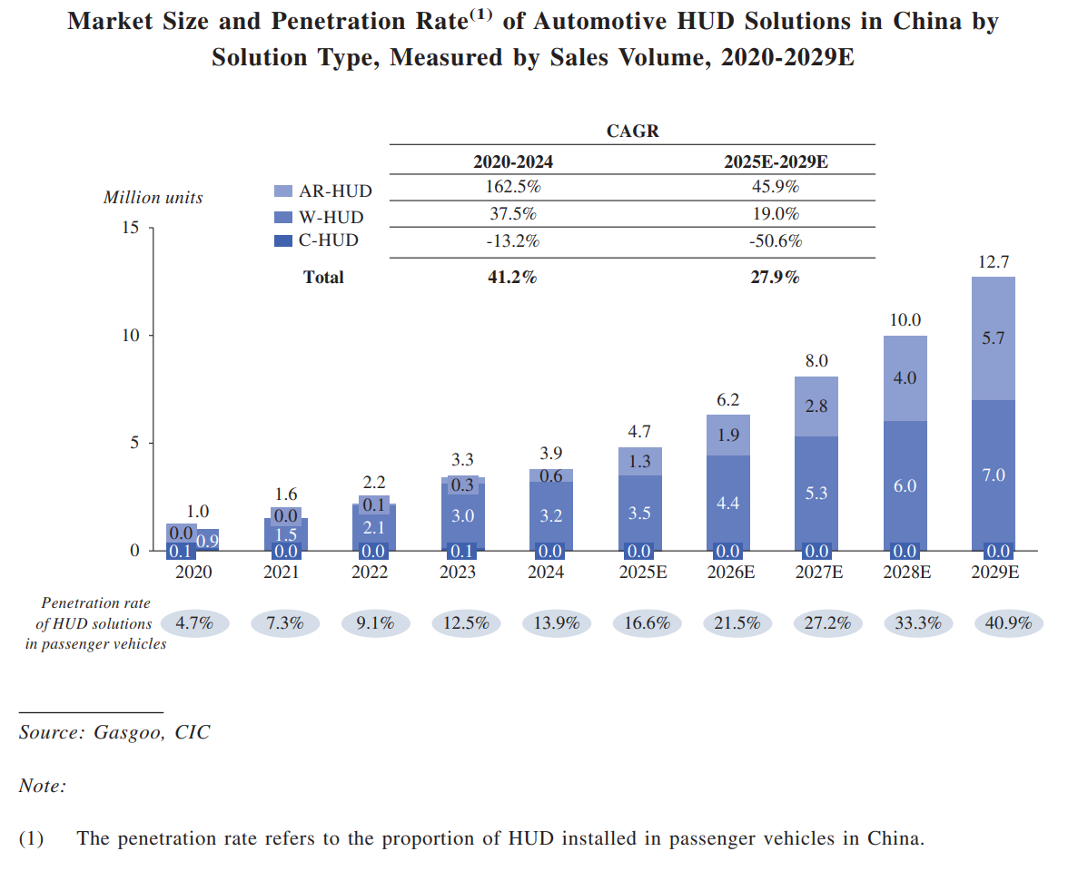 The market size of China's in-vehicle HUD solutions grew from approximately 1.0 million units in 2020 to about 3.9 million units in 2024, with a CAGR of approximately 41.2% during the period. It is projected to further grow to around 12.7 million units by 2029, with a CAGR of about 27.9% from 2025 to 2029, indicating the industry is still in a stage of rapid development.