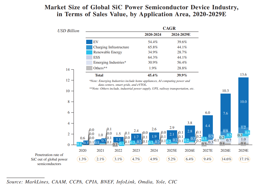SiC power semiconductor devices demonstrate superior performance characteristics in breakdown voltage, thermal conductivity, electron saturation velocity and radiation resistance, offering broader applicability in medium-to-high voltage applications above 600V. These devices are increasingly deployed across electric vehicles (EVs), charging infrastructure, renewable energy, energy storage systems, as well as emerging applications including home appliances, AI computing and data centers, smart grids and eVTOL (electric vertical take-off and landing) aircraft.
