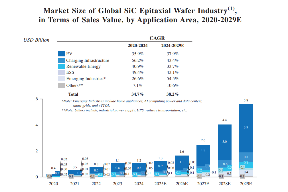 The global SiC epitaxial wafer market has experienced continuous growth in recent years, with market size increasing from US$0.4 billion in 2020 to US$1.2 billion in 2024, representing a CAGR of 34.7%. The market is projected to reach US$5.8 billion by 2029, with a CAGR of 38.2% from 2024 to 2029. Electric vehicles represent the largest application segment, with related market size expected to reach US$3.9 billion by 2029. Additionally, charging infrastructure, renewable energy, energy storage systems and emerging application areas maintain robust growth momentum, continuously driving industry expansion.