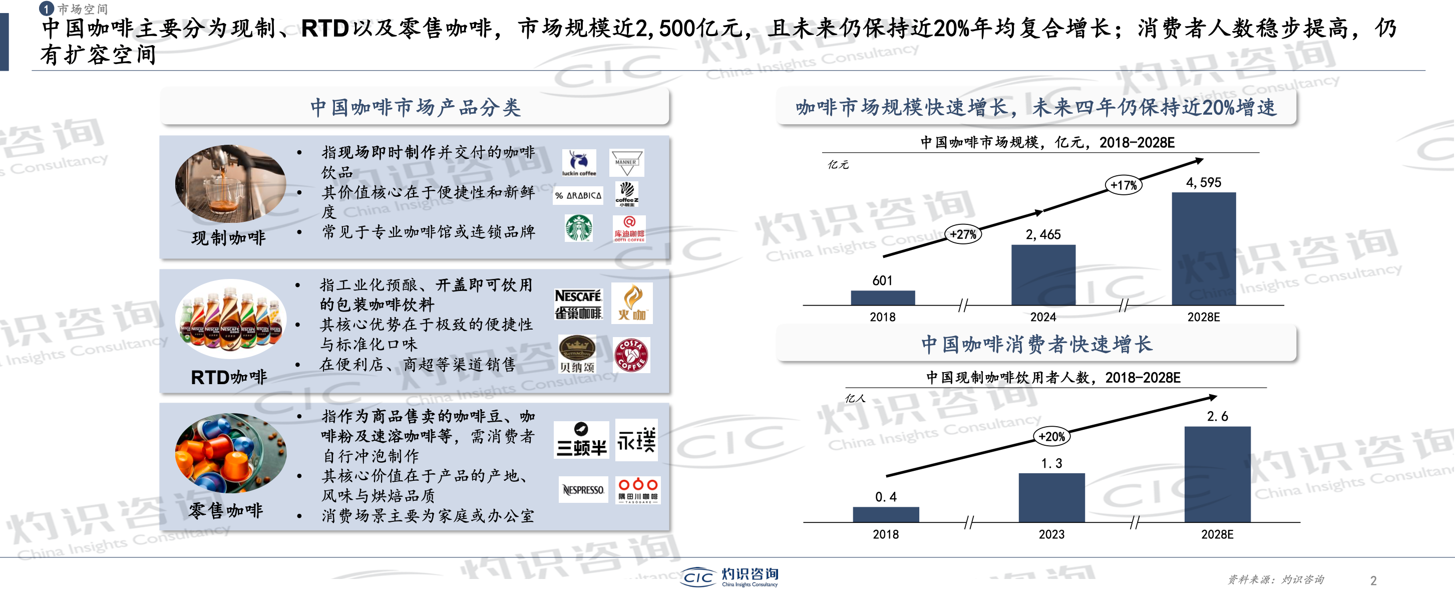 白皮书指出,中国咖啡市场规模庞大且增长迅速,主要分为现制、RTD以及零售咖啡,市场规模近2,500亿元,且未来仍保持近20%年均复合增长。消费者人数稳步提高,仍有扩容空间。