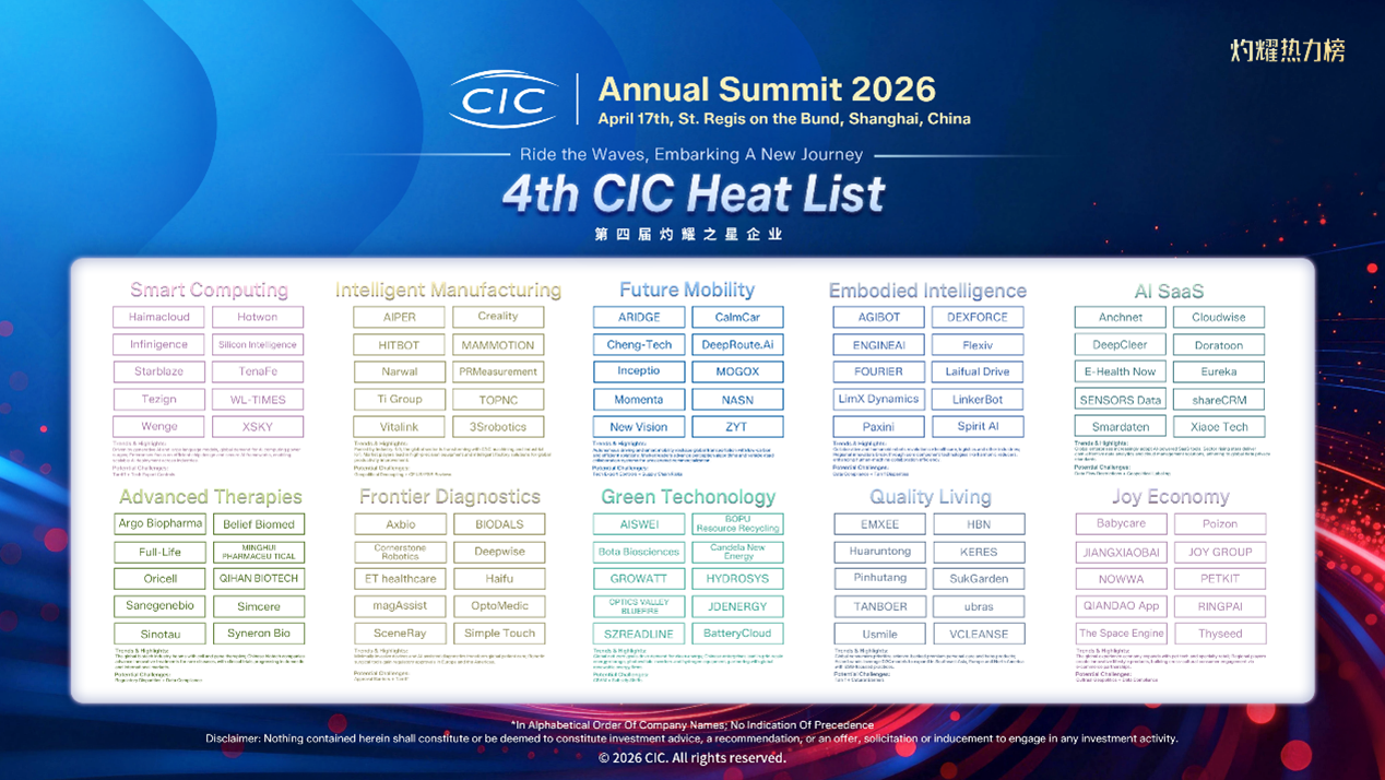 Following the January release of the 4th CIC Heat List, the summit will serve as the official platform to honor 100 high-potential unlisted enterprises—dubbed “Rising Stars.” Selected across ten frontier sectors, they include Smart Computing, Embodied AI, Future Mobility, Green Tech, Bio Tech, New Consumer Retail, and more.