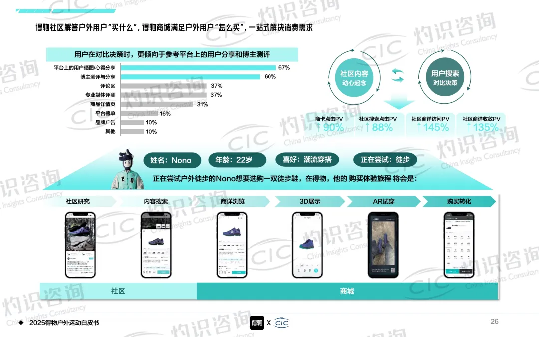 内容平台正深刻重塑户外消费决策路径。真实用户分享与专业博主测评成为影响购买行为的关键因素,有效推动商品销量增长。随着消费者对产品功能性和专业性要求的持续提升,以得物为代表的平台通过构建“正品保障+真实内容+精准流量”的核心能力体系,已成为户外品牌高效触达年轻群体的主阵地。平台汇聚上1,300家户外品牌,借由社区互动、达人测评、AR试穿等多元内容形态,显著降低用户决策成本,提升消费意愿与信任度。得物通过持续优化“内容-交易”闭环,为品牌提供了从种草到转化的完整解决方案,成为户外品类增长的重要引擎。