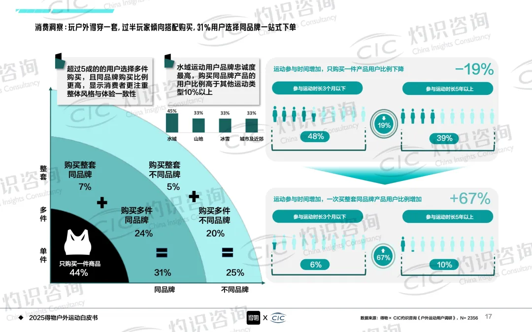 随着运动类型的丰富,户外运动的消费水平也在逐步提高。过半用户倾向于搭配购买,尤其偏好同品牌产品,突出了对整体风格和一致性的需求。随着运动经验的积累,消费者的支出也逐渐增加,特别是在高消费群体中。运动参与时间的延长促使用户从基础鞋服消费扩展到更专业的运动装备,反映出消费者在功能性和专业化方面的需求提升,体现了户外消费向高端化、系统化发展的趋势。