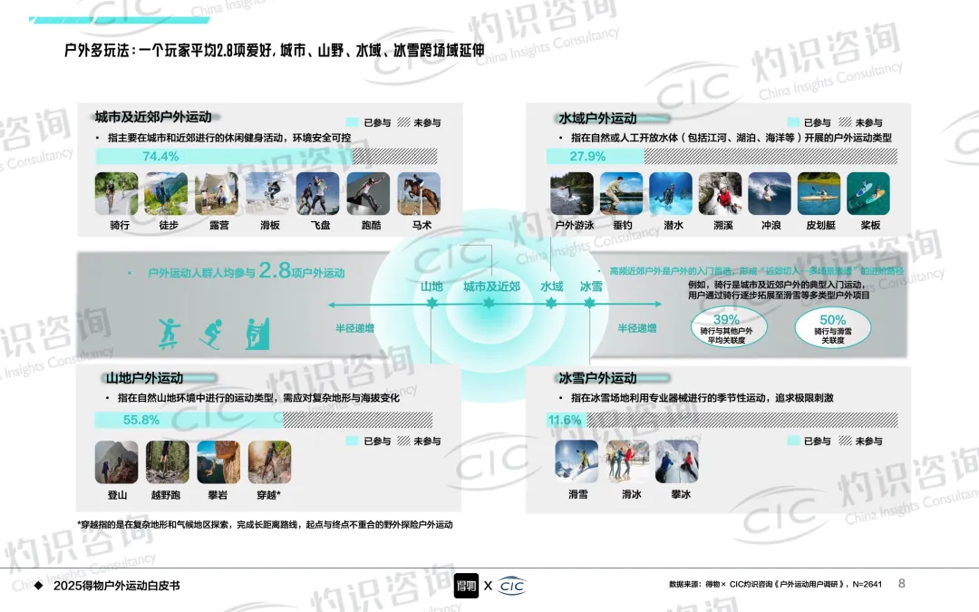 政策、赛事、品牌、设施四维协同推动产业跨越式发展。自2008年北京奥运会奠定基础,到2022年冬奥会带动冰雪热潮,政策红利持续释放,基础设施不断完善,国内外品牌共同发力,推动中国户外运动参与率突破30%。与美国等成熟市场相比,中国户外运动参与率仍具备约2倍增长空间,发展潜力巨大。户外运动呈现"城市近郊-山野-水域-冰雪"多圈层渗透特征,用户人均参与2.8项户外运动,形成从城市骑行向滑雪等场景自然延伸的参与路径。