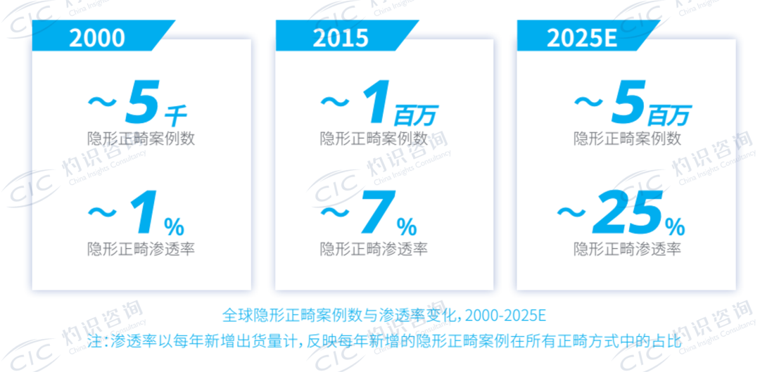 过去三十年,全球正畸市场保持健康增长,隐形正畸病例数快速增长,见证了隐形正畸技术从创新萌芽到广泛应用的跨越式发展。基于材料科学和其他底层技术的迭代,隐形正畸凭借美观、舒适与便利的优势,实现了渗透率的快速提升,成为现代正畸的重要组成部分。2025年,隐形正畸年新增案例数预计将增长至约500万例,中国市场年新增案例数亦突破50万例;在一些国家和地区,隐形正畸案例数在新增案例数中的占比可达到30%-40%。